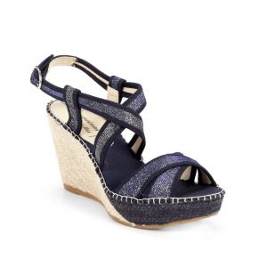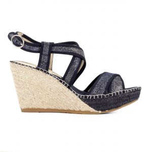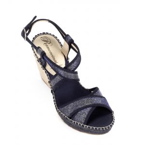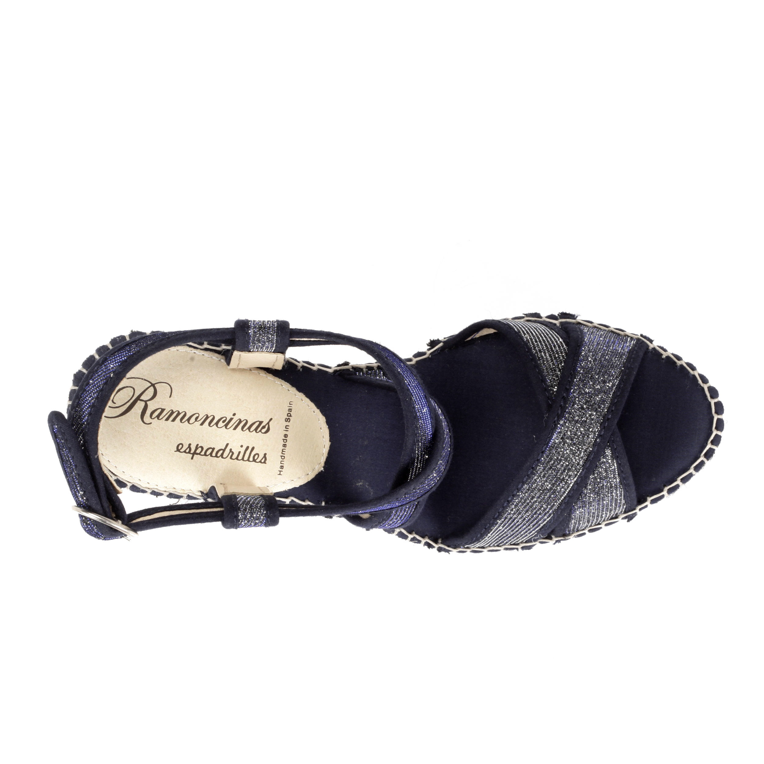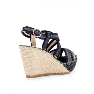 Sandalia cruzada tejido brillante marino en suela miss flor bicolor 9 cm
