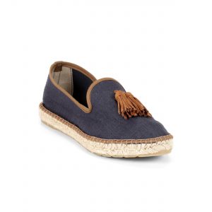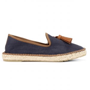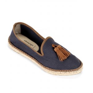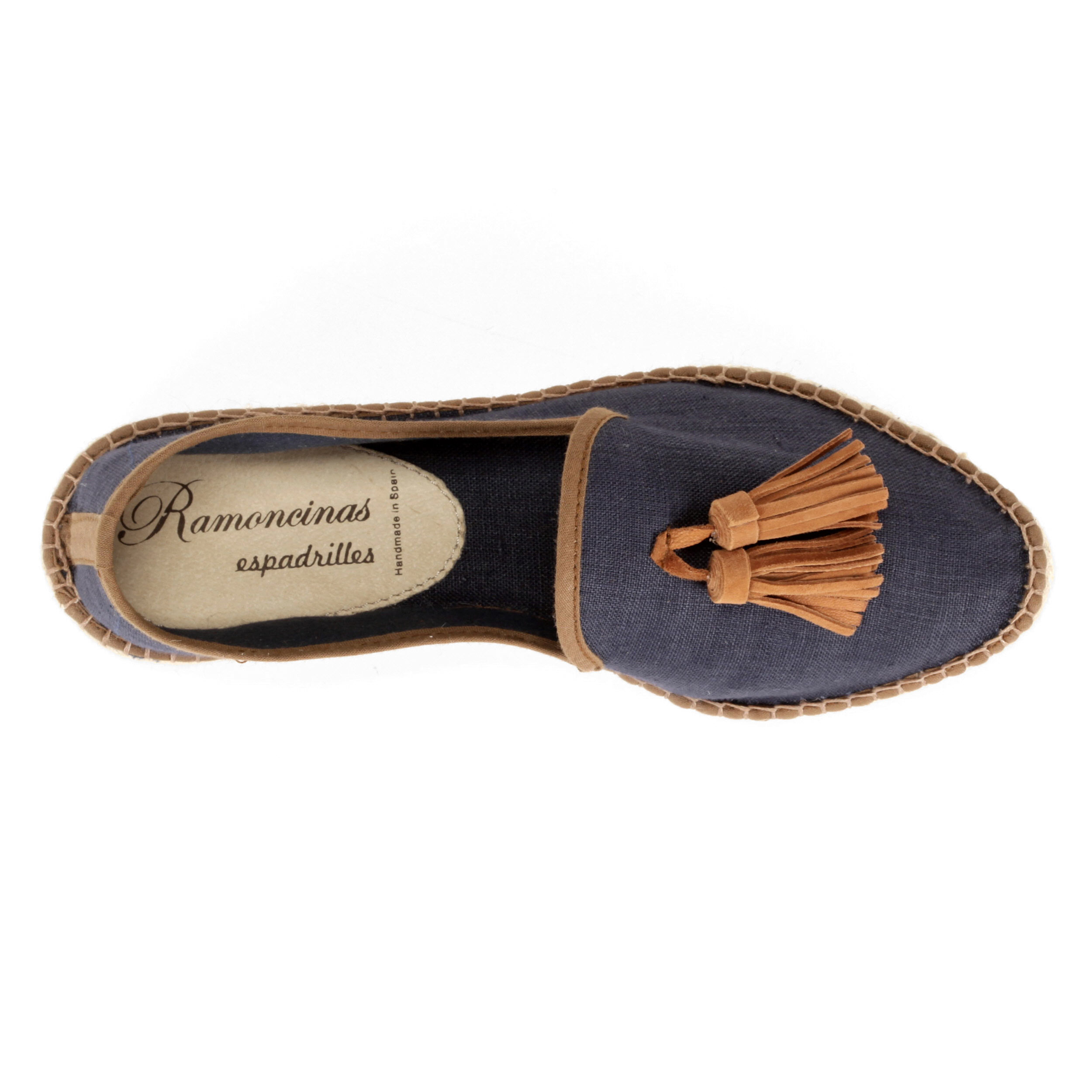 Slipper lino marino con borlas y ribete en cuero y piso plano natural