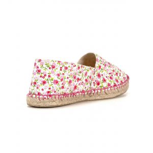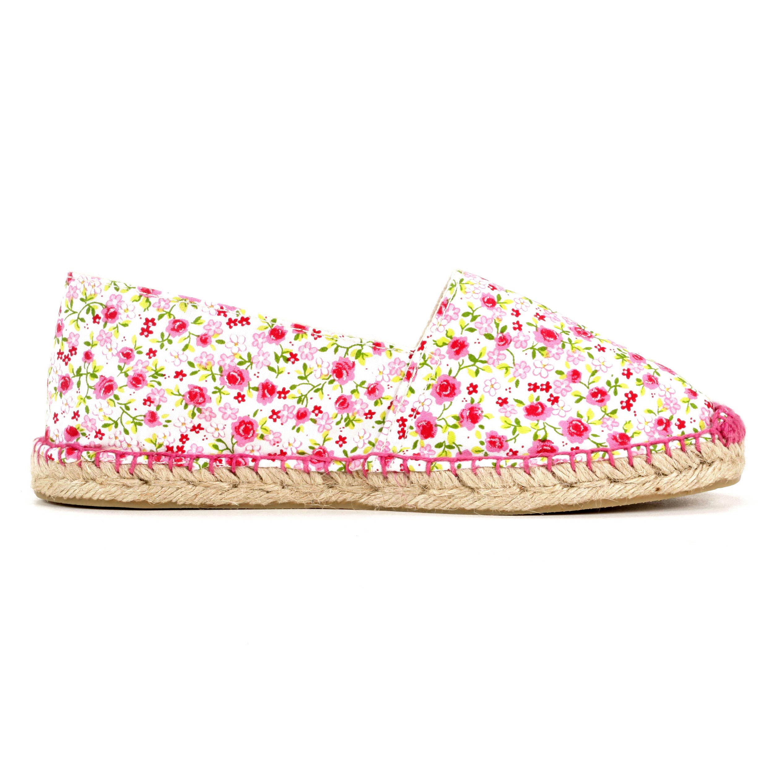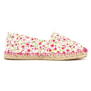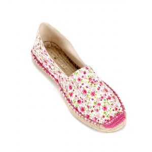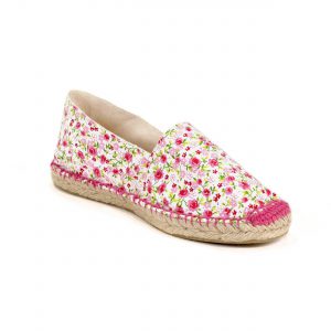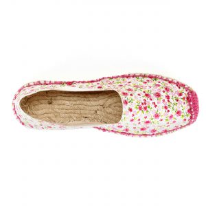 Camping básico en lona de flores en tonos rosas con hilo blanco y piso natural
