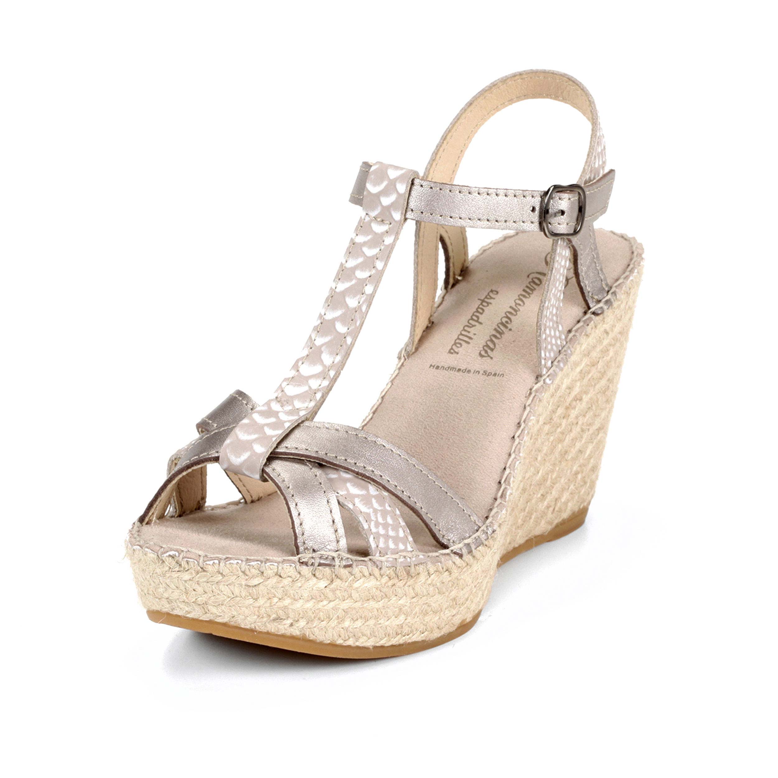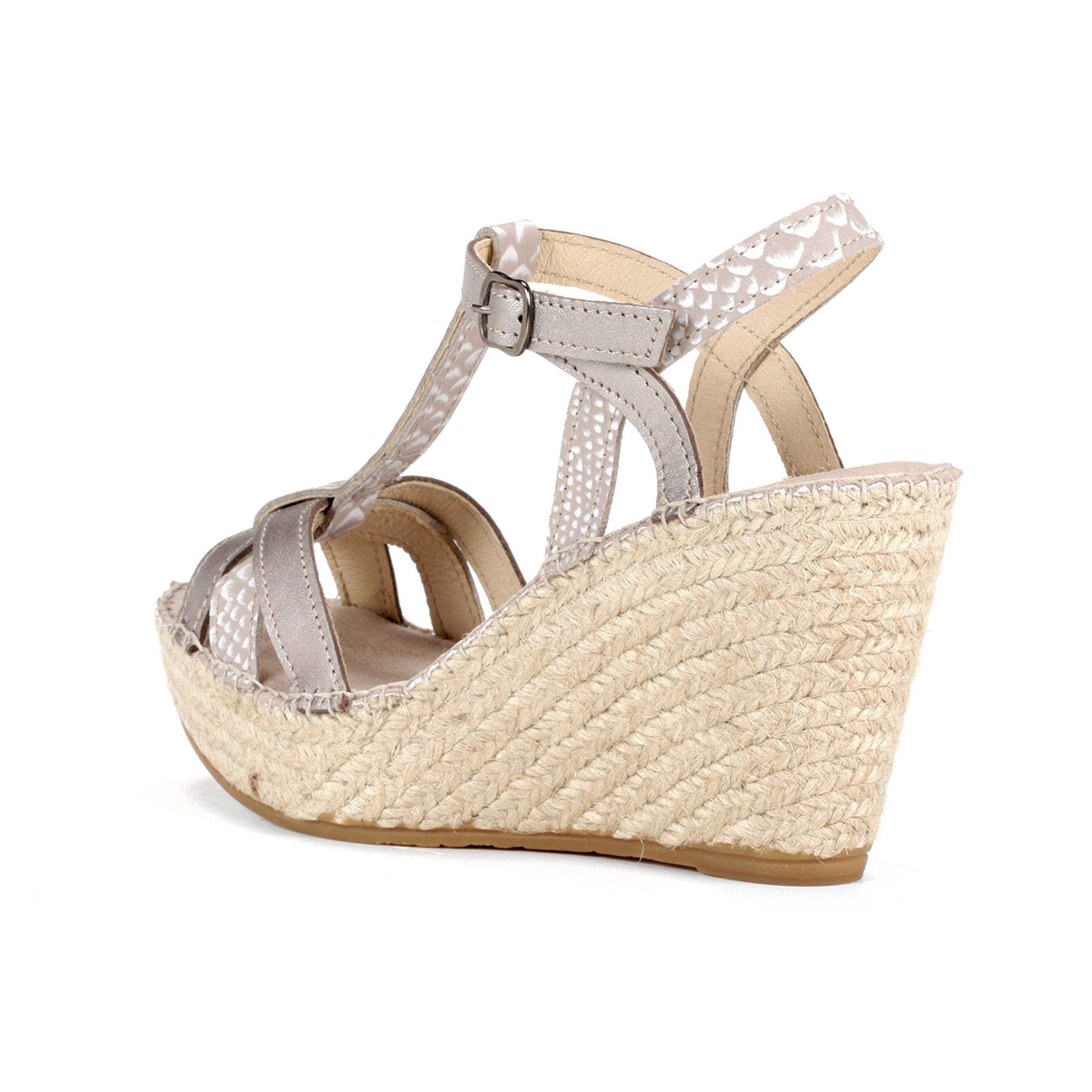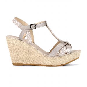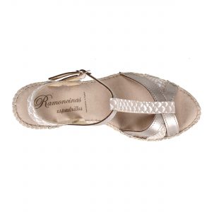 Sandalia multitiras en piel platino y piel de serpiente barley en suela miss flor bicolor 9cm