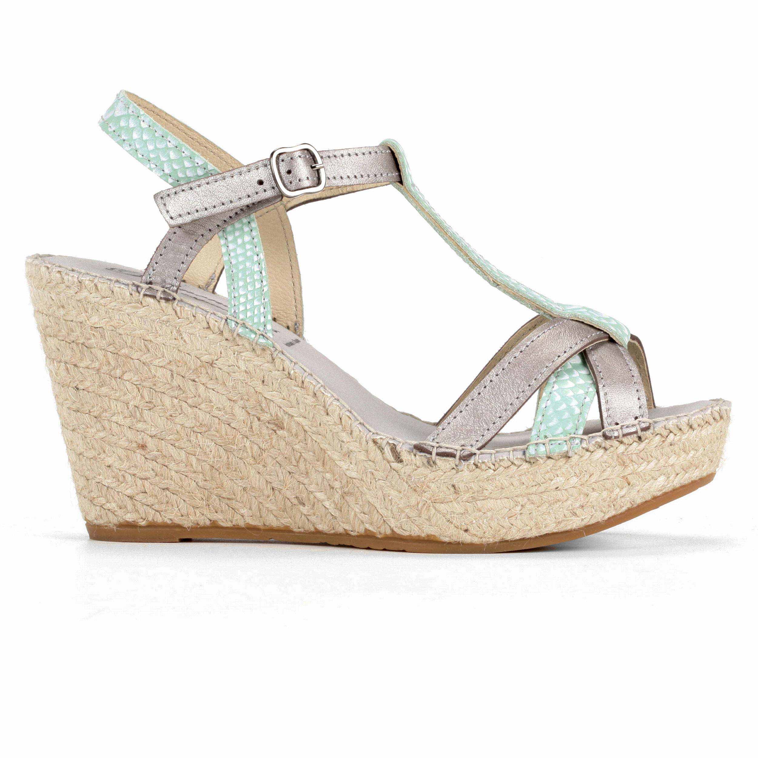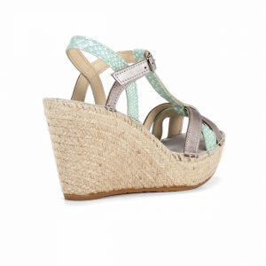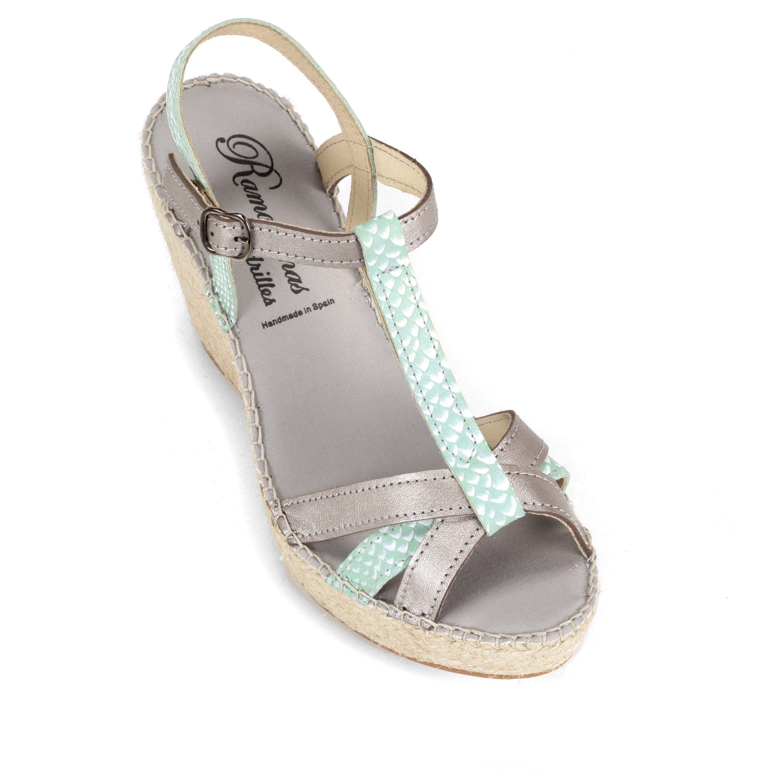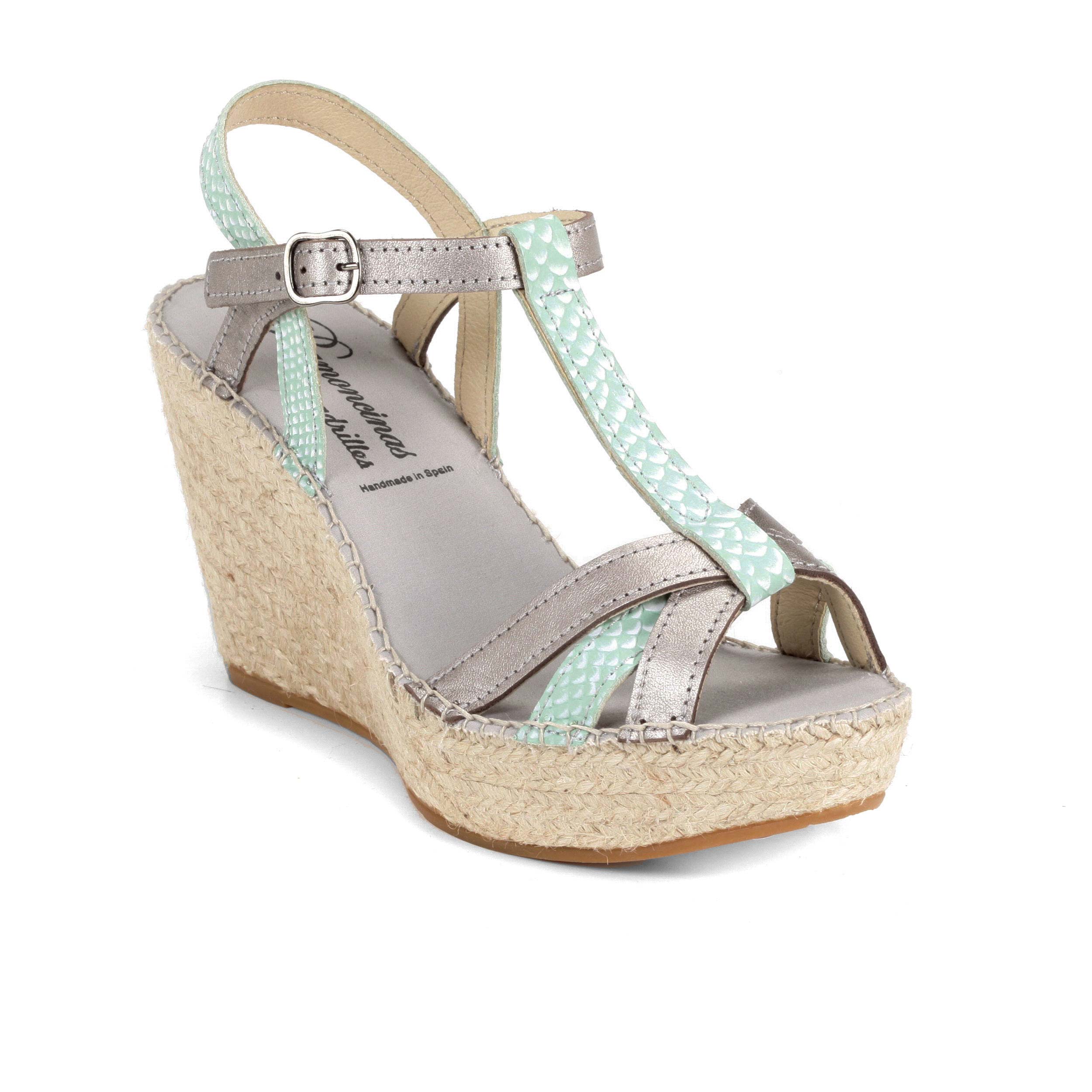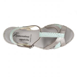 Sandalia multitiras en piel plomo y piel de serpiente mint en suela miss flor bicolor 9cm