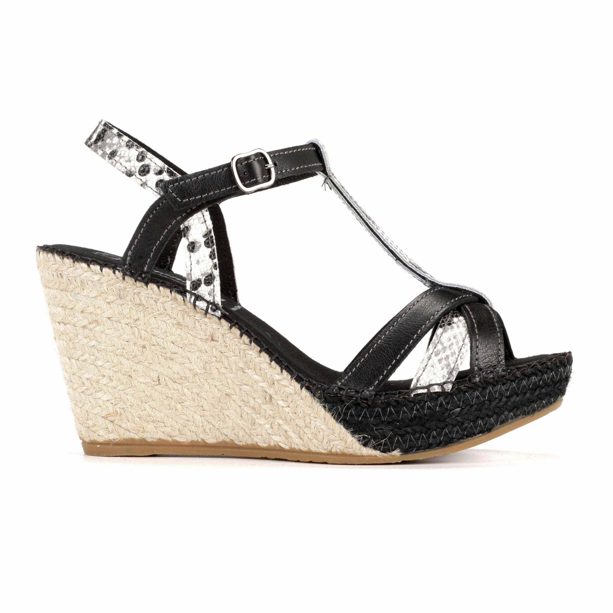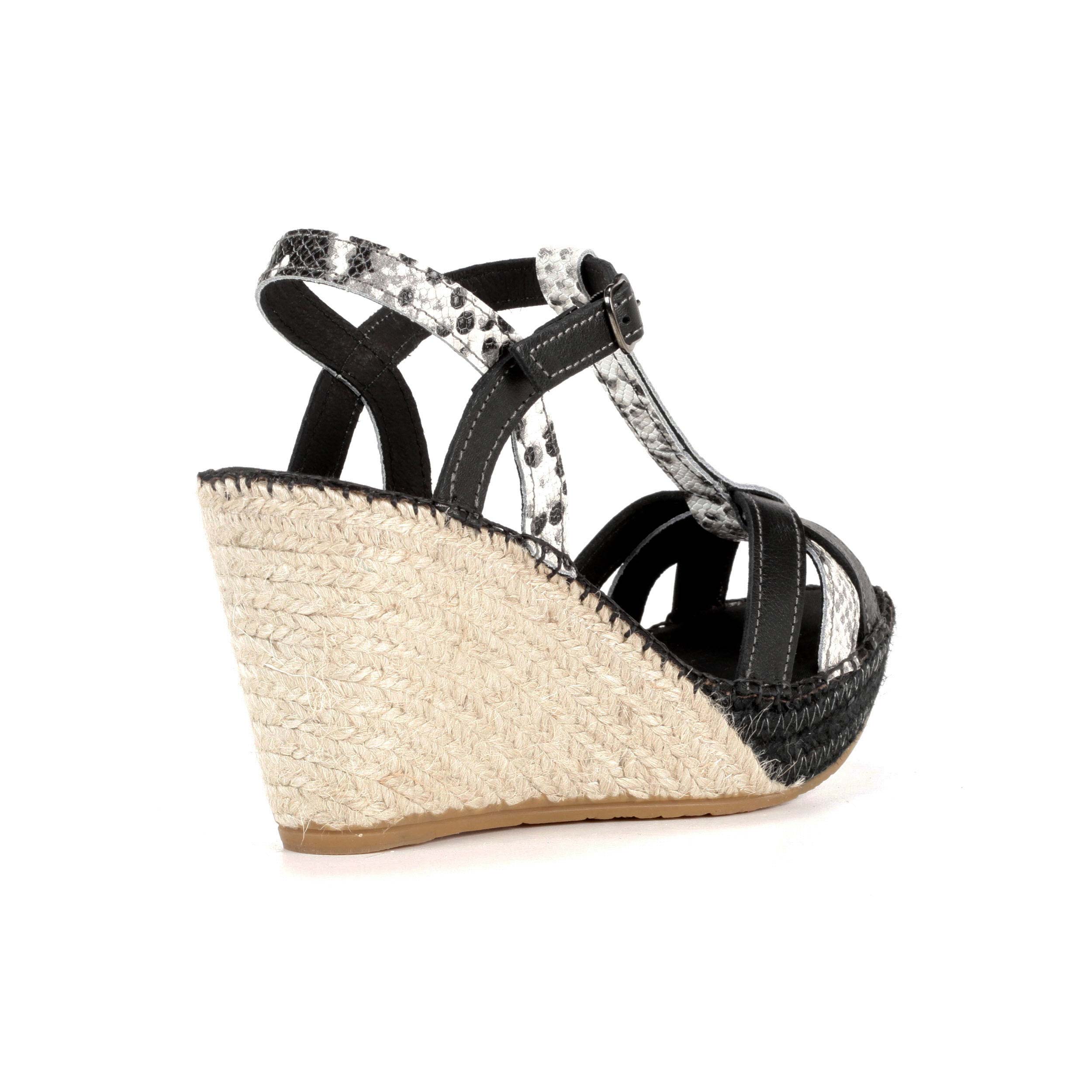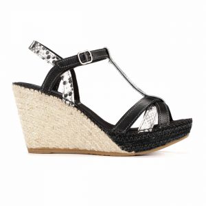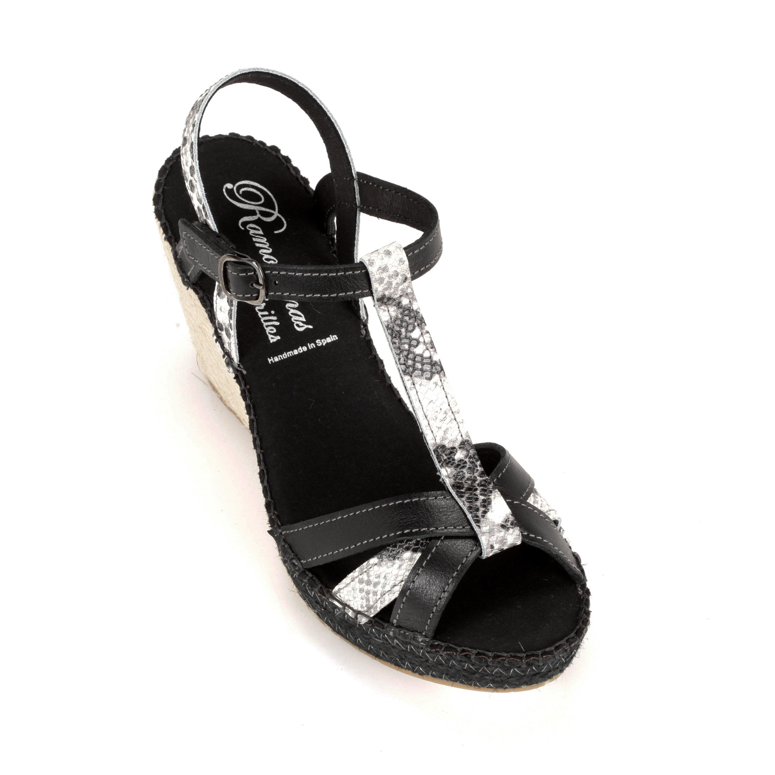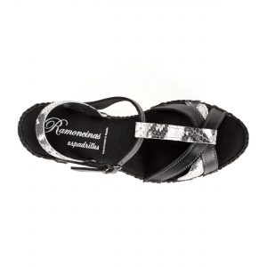 Sandalia multitiras en piel negra y piel de serpiente negro en suela miss flor bicolor 9cm