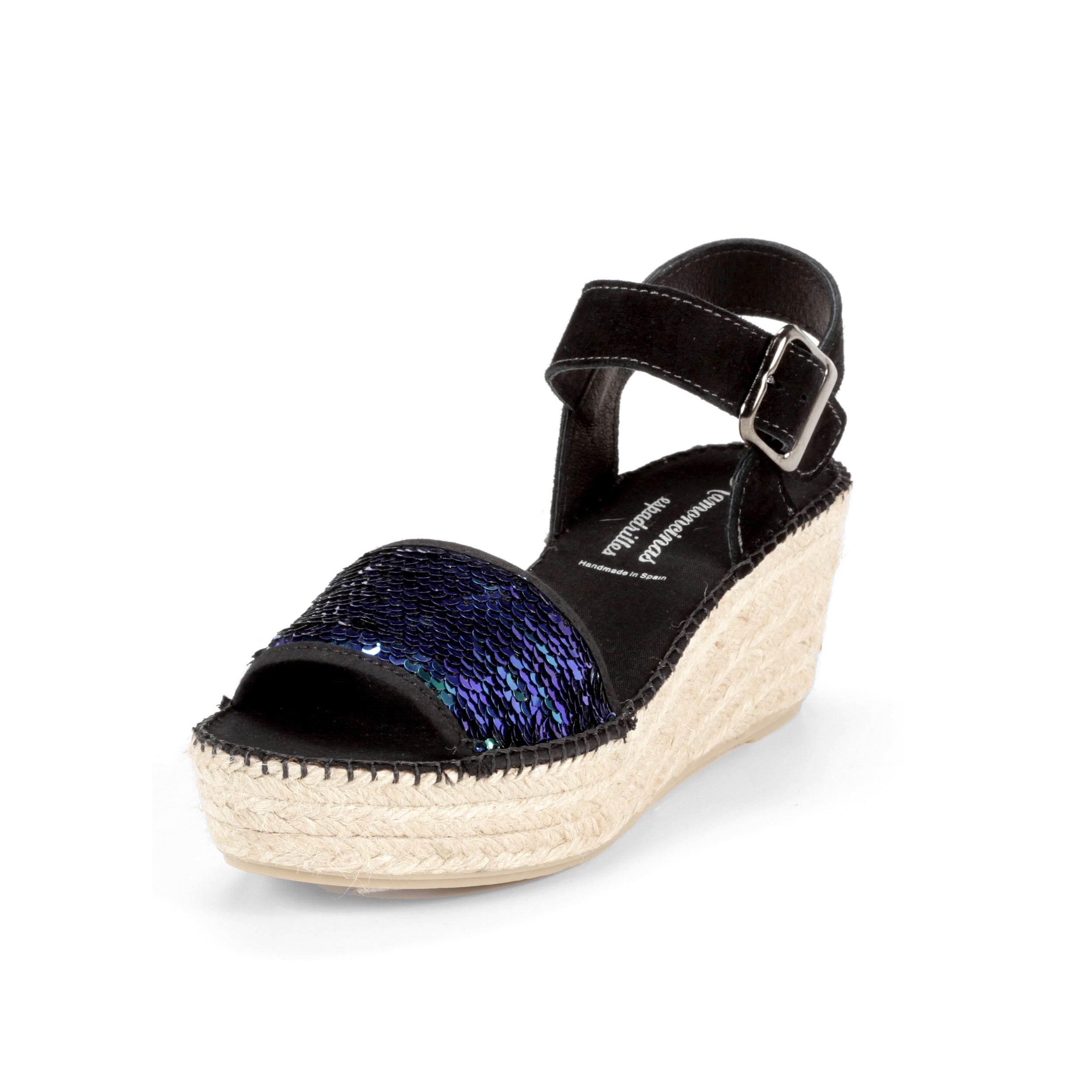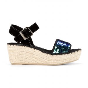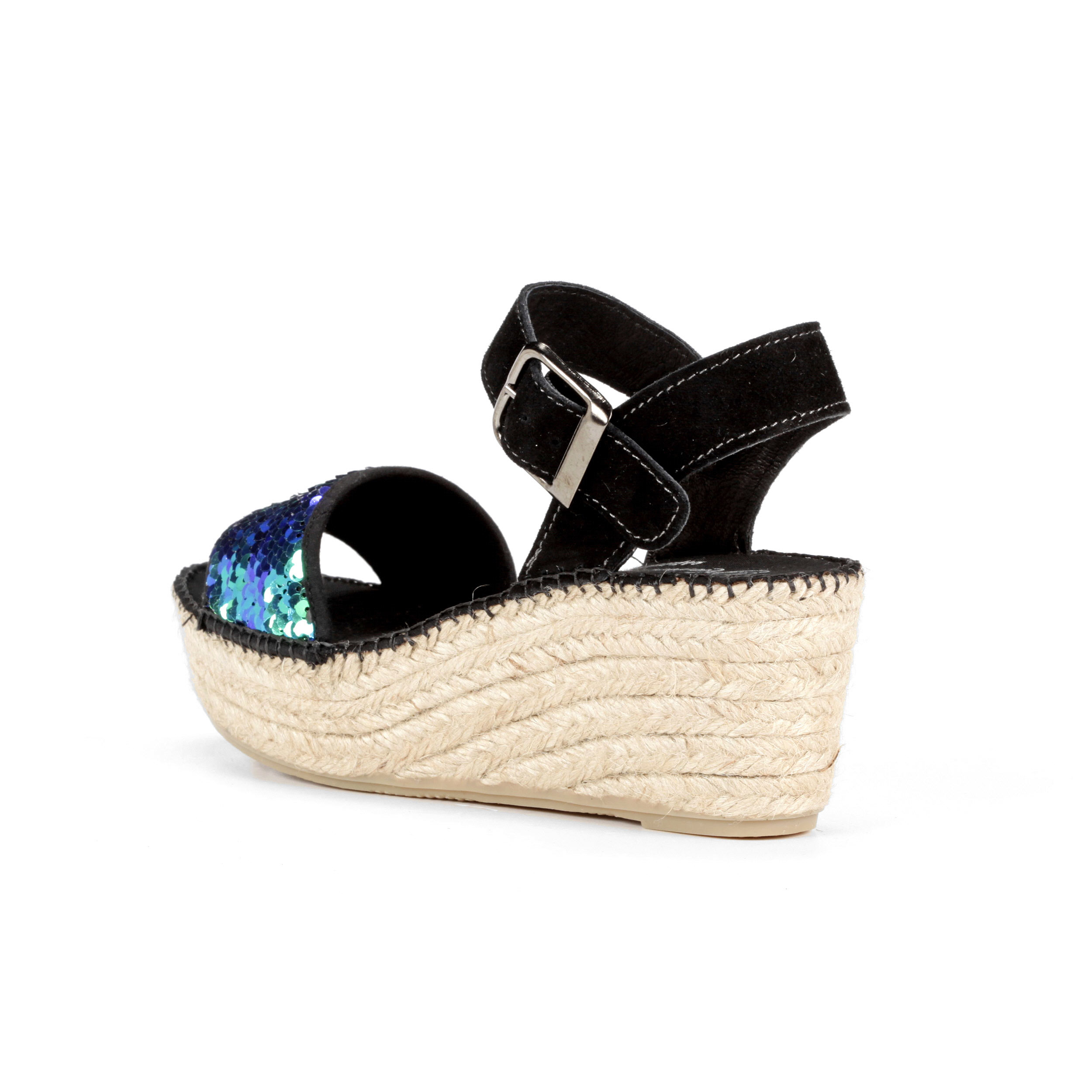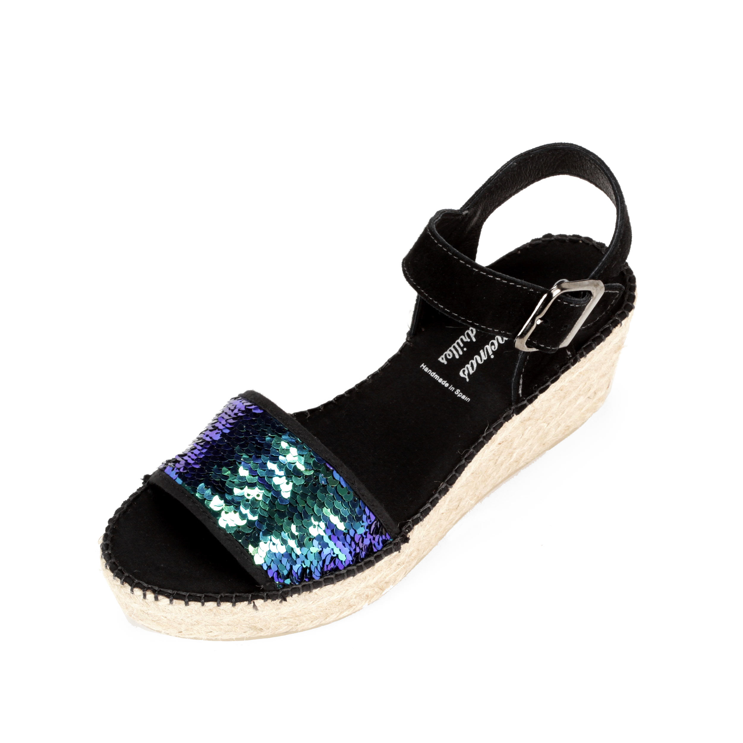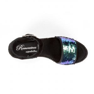 Sandalia de lentejuelas tornasoladas y ante negro en suela pekín 7cm