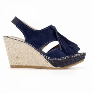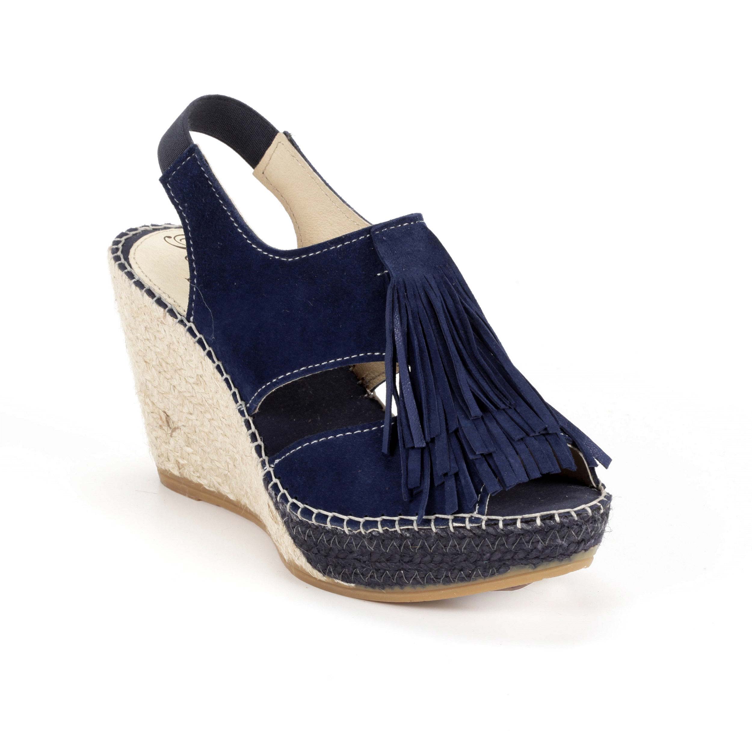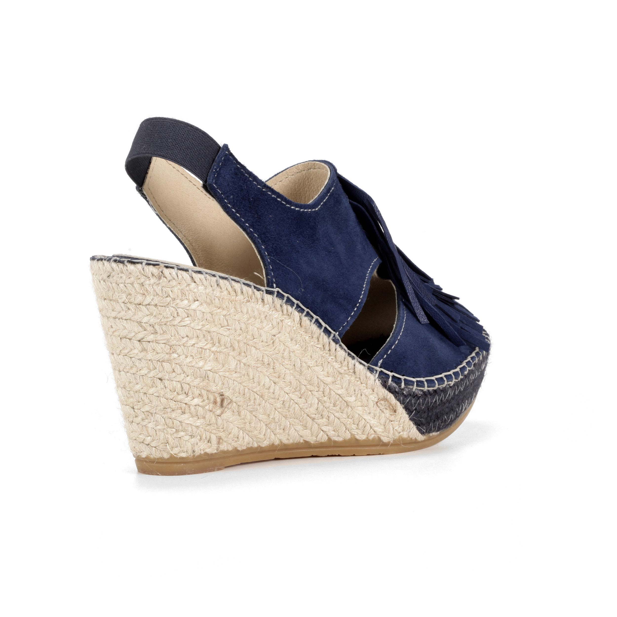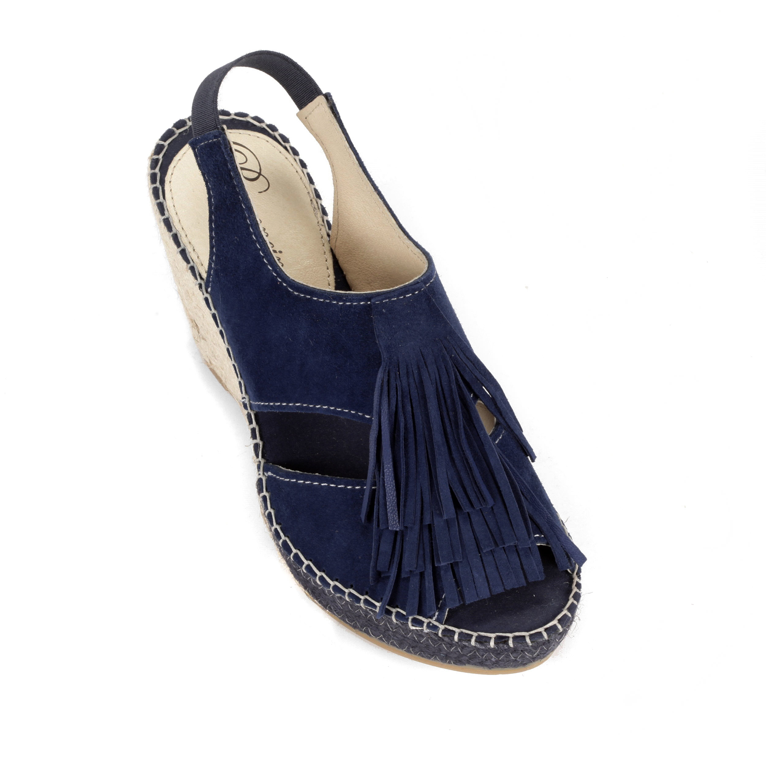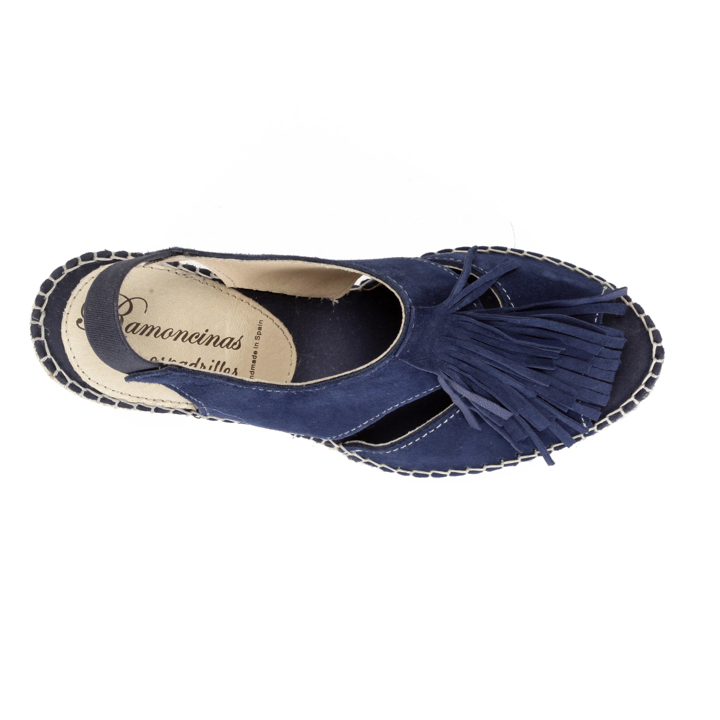 Zueco de ante marino con aberturas laterales y flecos en el empeine en suela miss flor bicolor 9cm