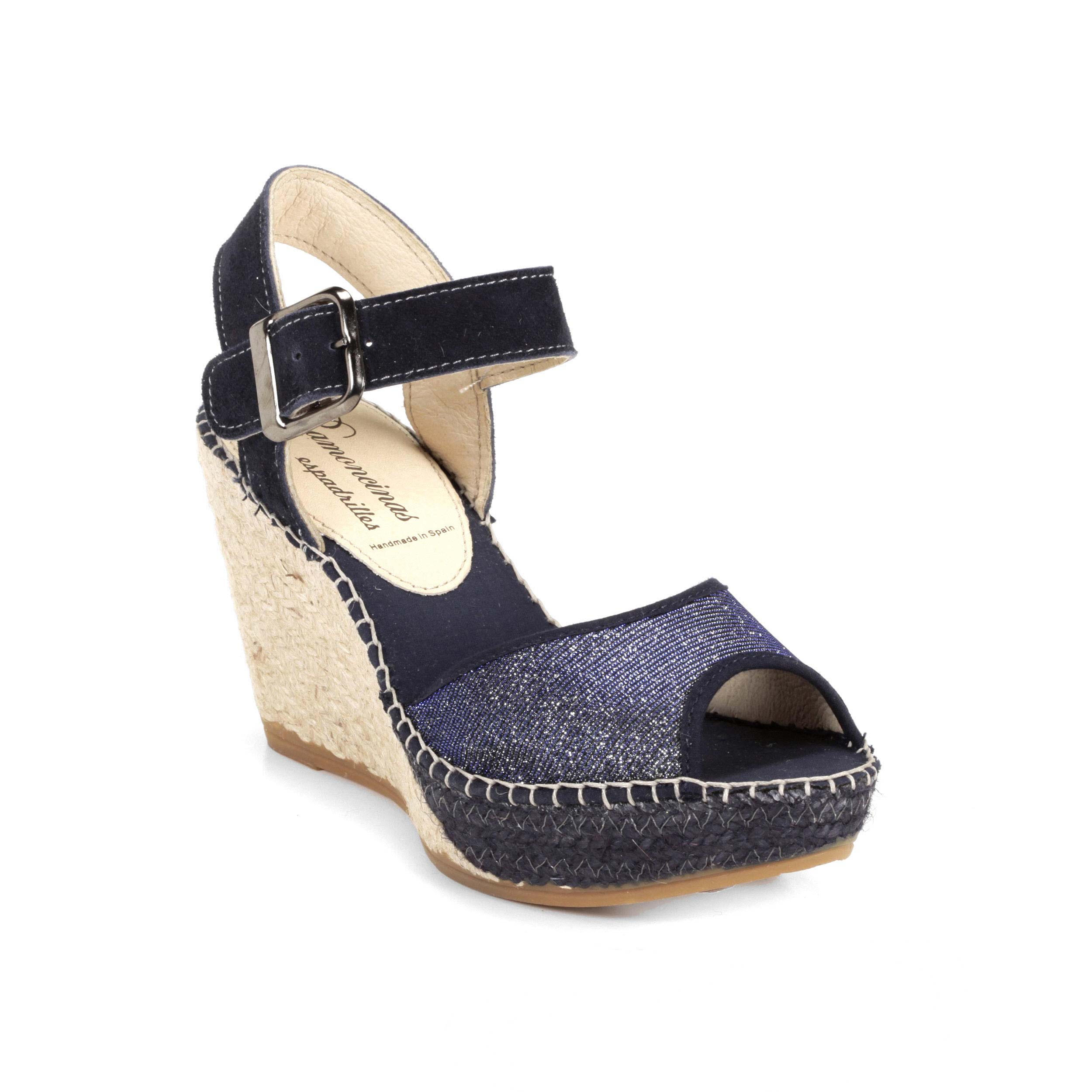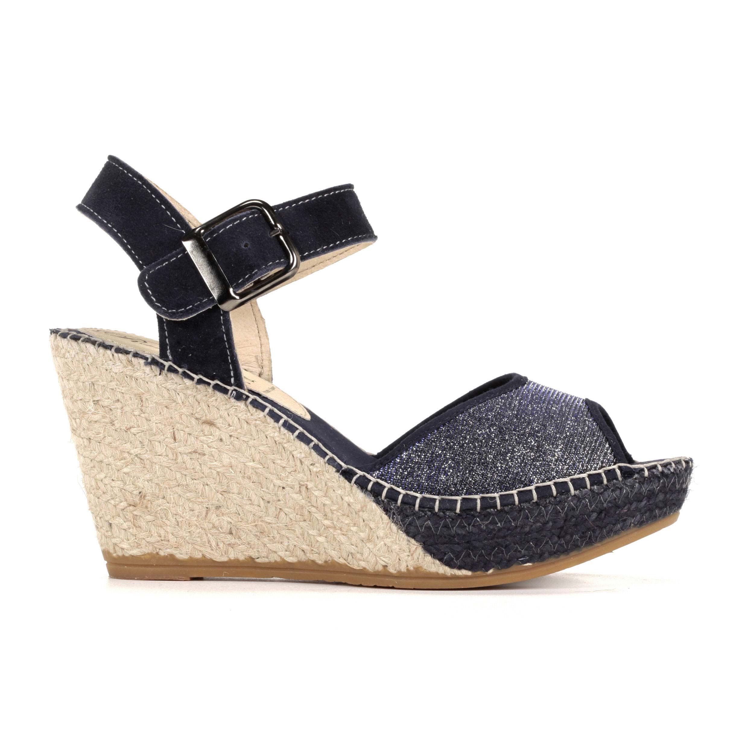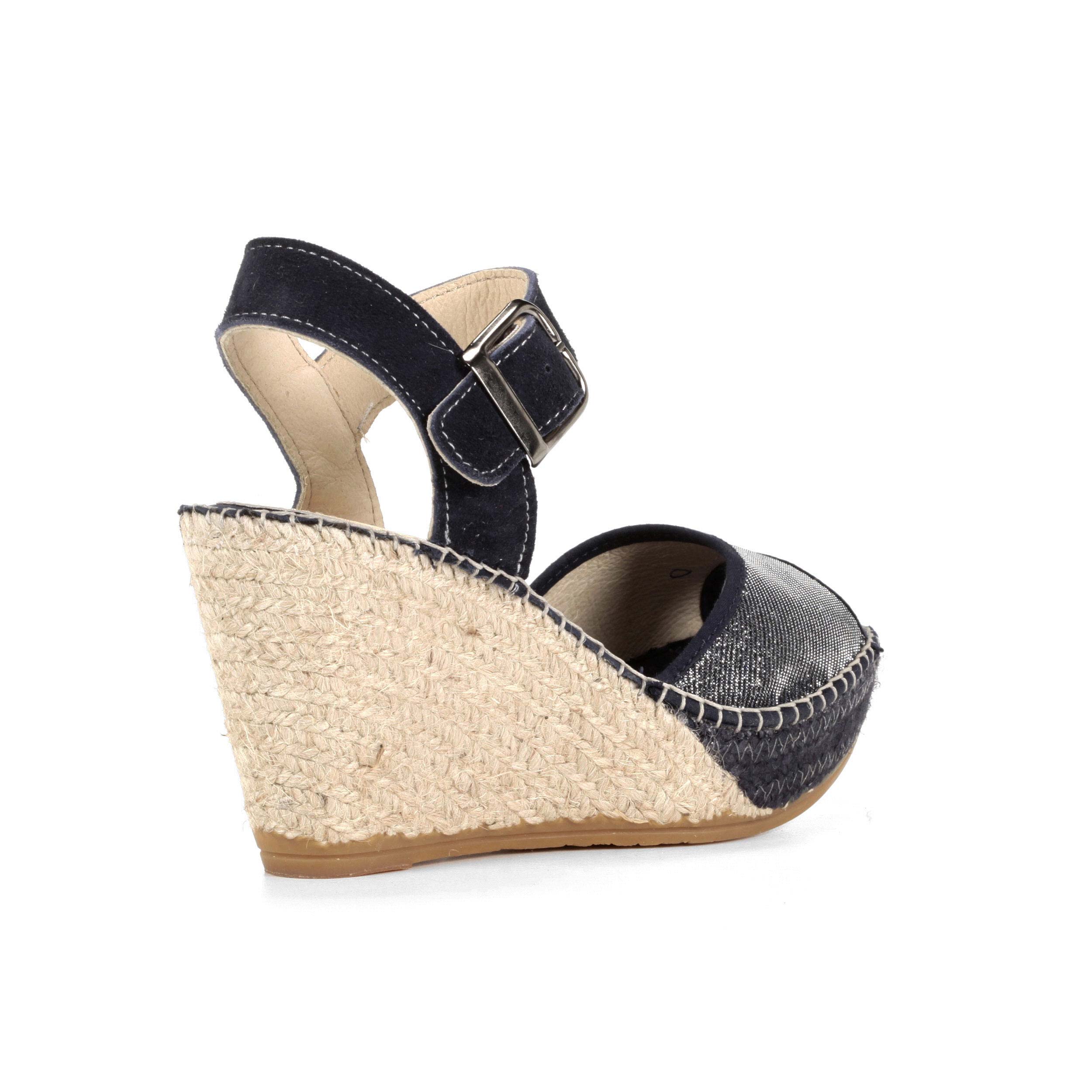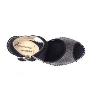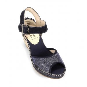 Sandalia de tejido brillante marino y trasera de ante indico en suela miss flor bicolor 9 cm