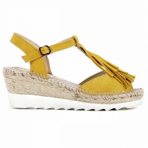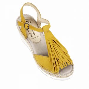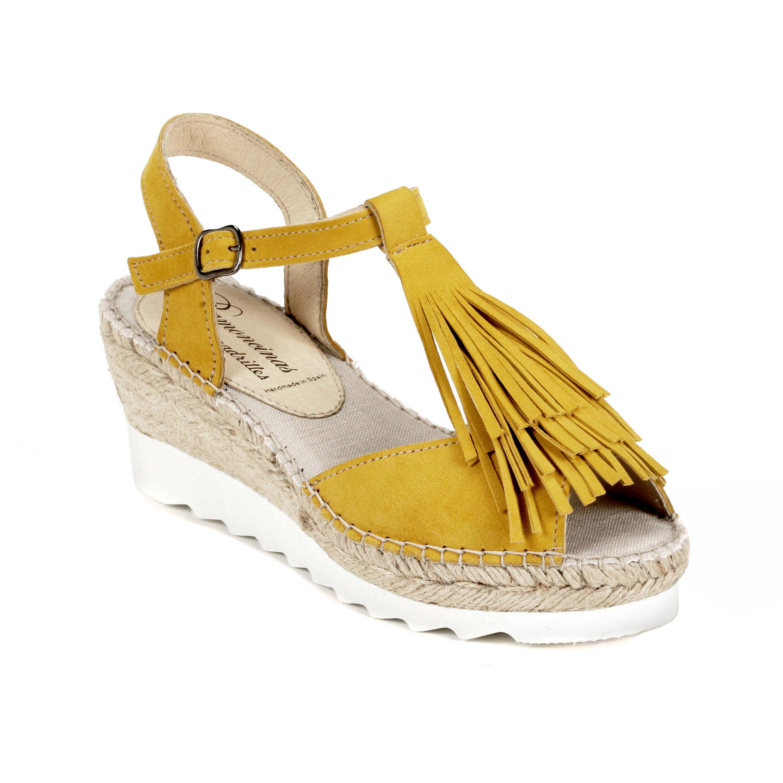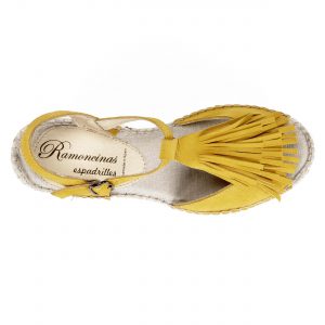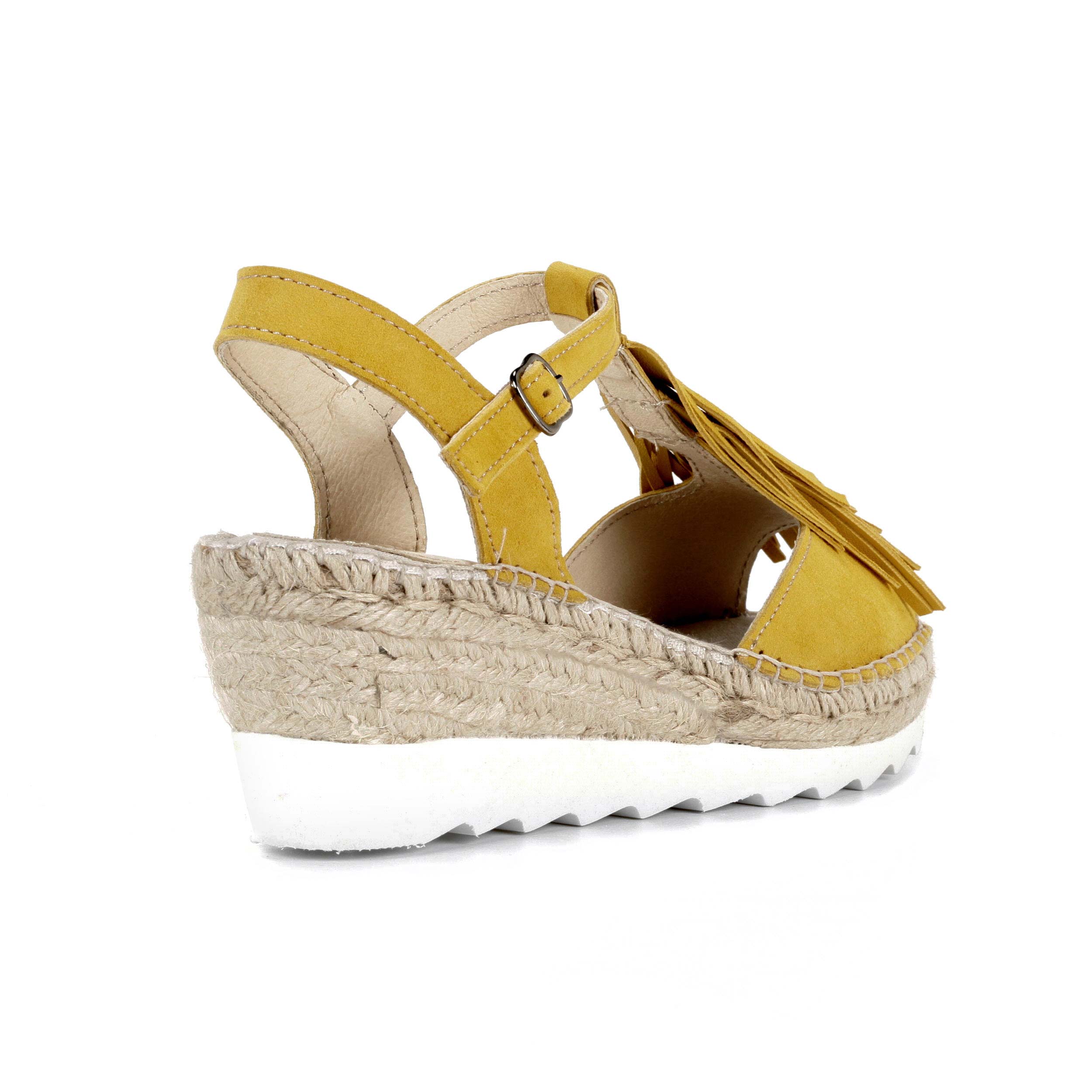Sandalia de ante pistil y empiene con flecos en suela tres cuerdas cuña eva blanca 7cm