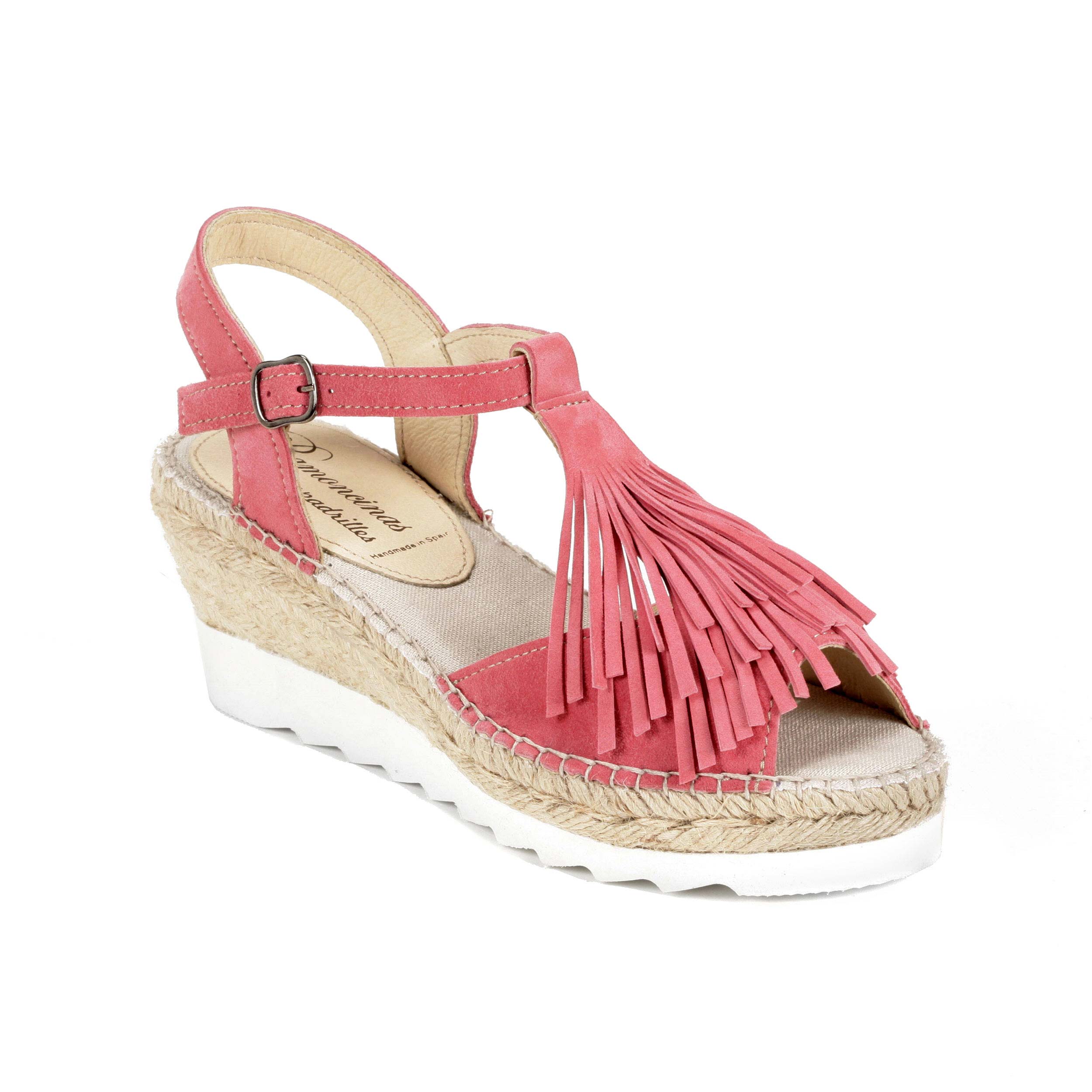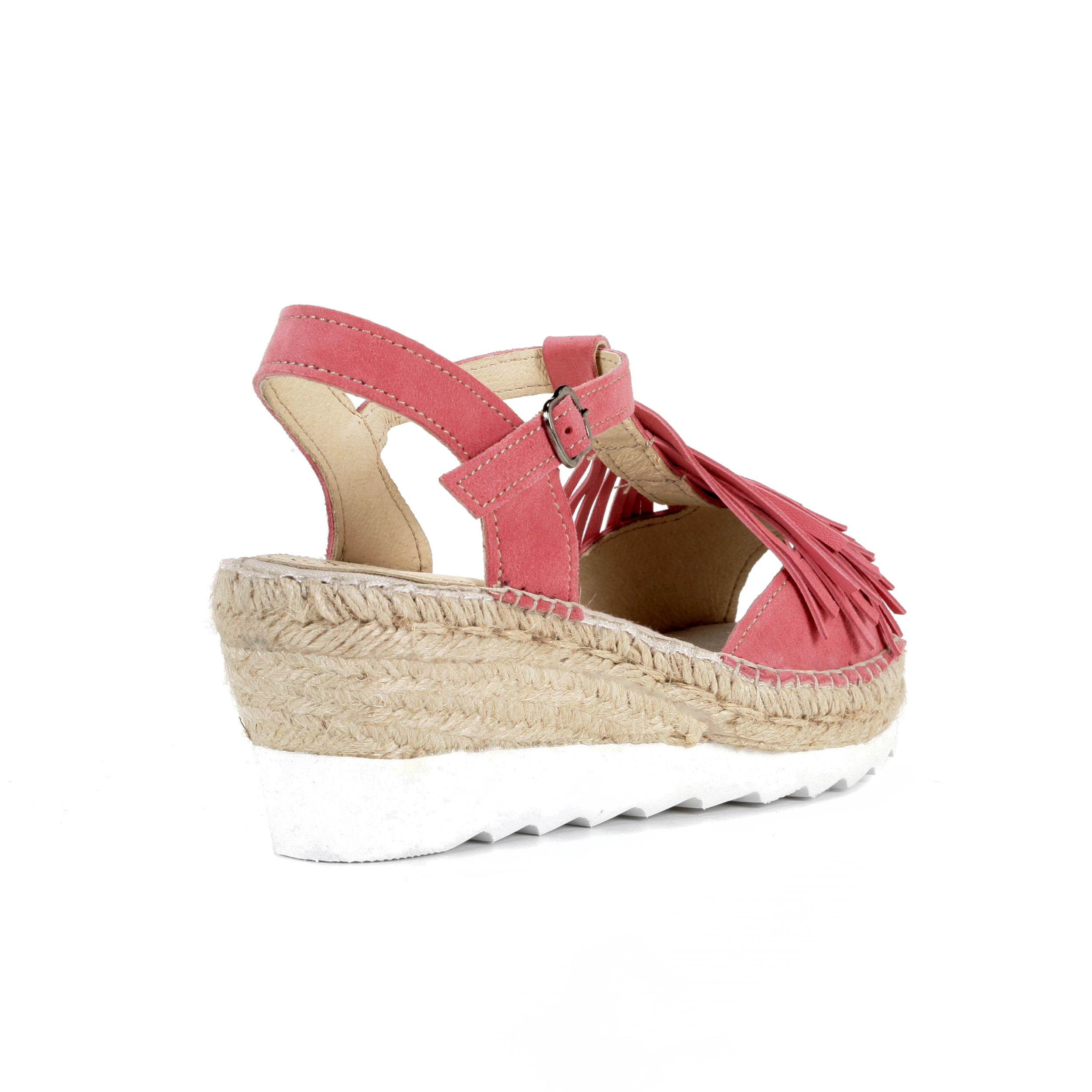 Sandalia de ante rosa y empiene con flecos en suela tres cuerdas cuña eva blanca 7 cm