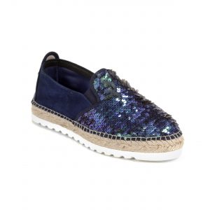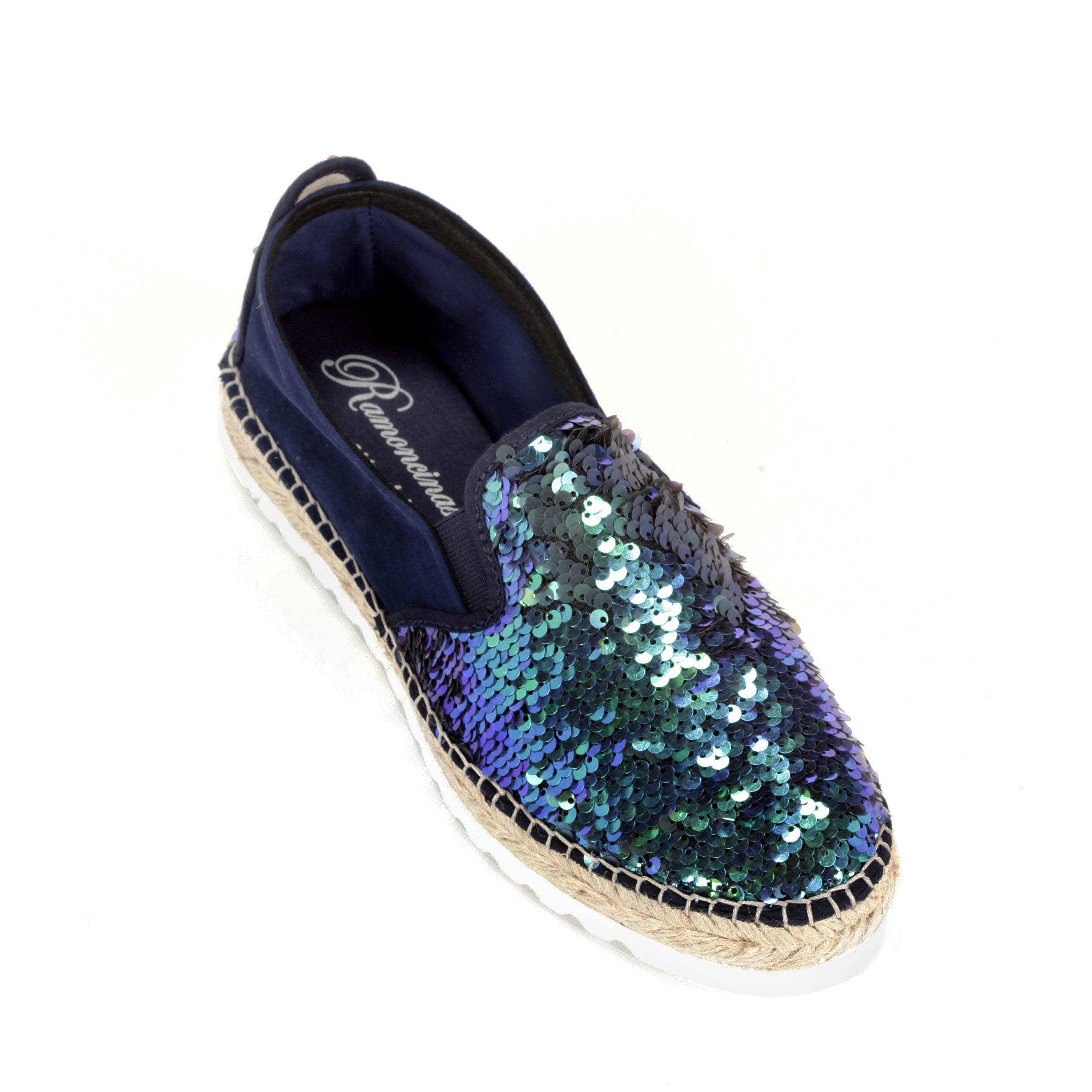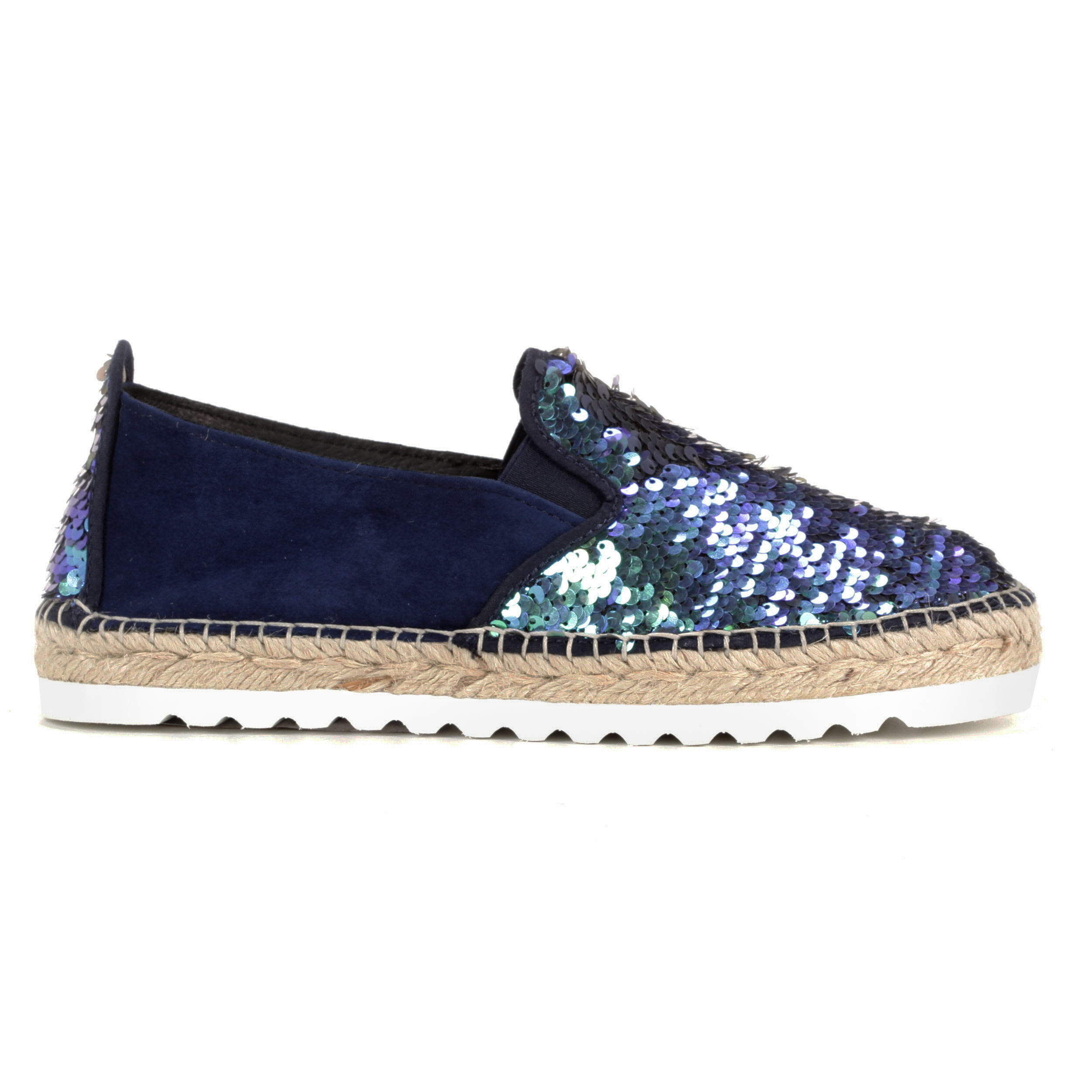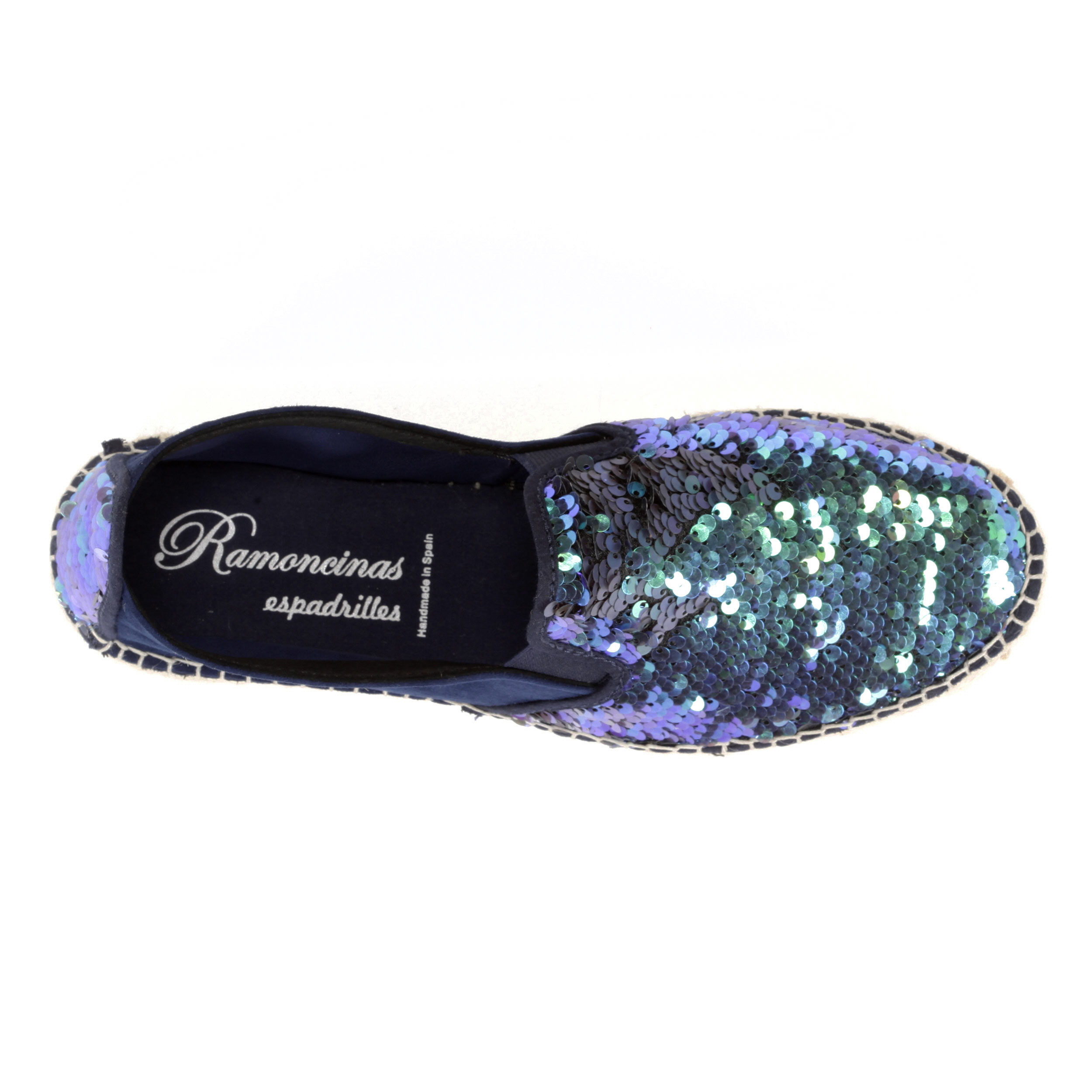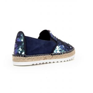 Cangrejera en tejido lentejuelas oceano con trasera de ante marino en suela eva blanca 3 cm